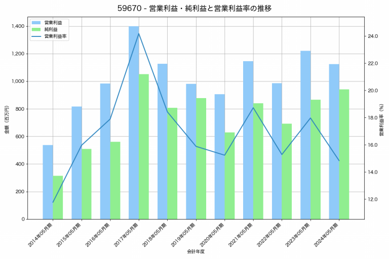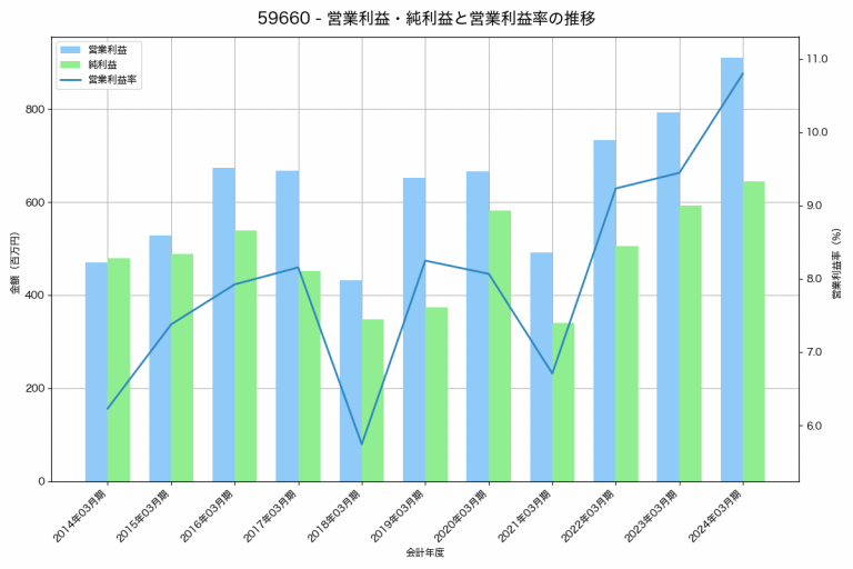京都機械工具の2024年03月期の営業利益は910百万円、営業利益率は10.8%と前年比117百万円増、営業利益率は1.4%pt増です。
