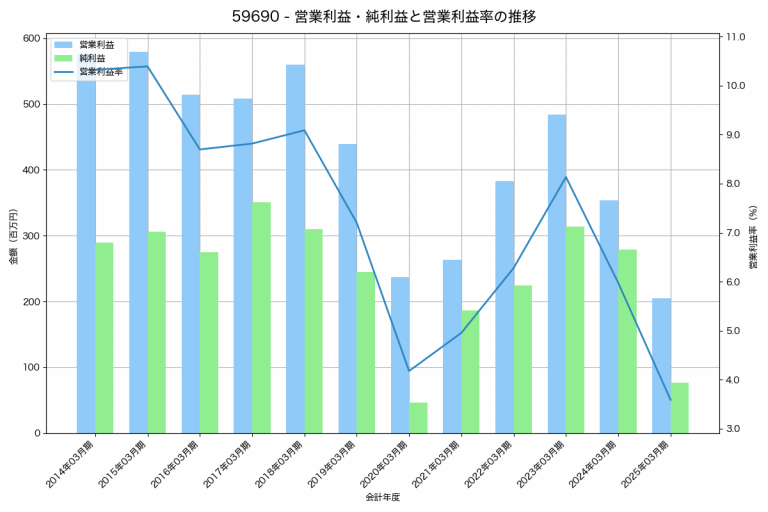 ロブテックスの2025年03月期の営業利益は205百万円、営業利益率は3.6%と前年比149百万円減、営業利益率は2.4%pt減です。