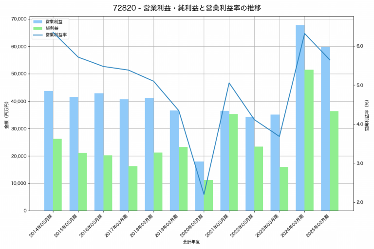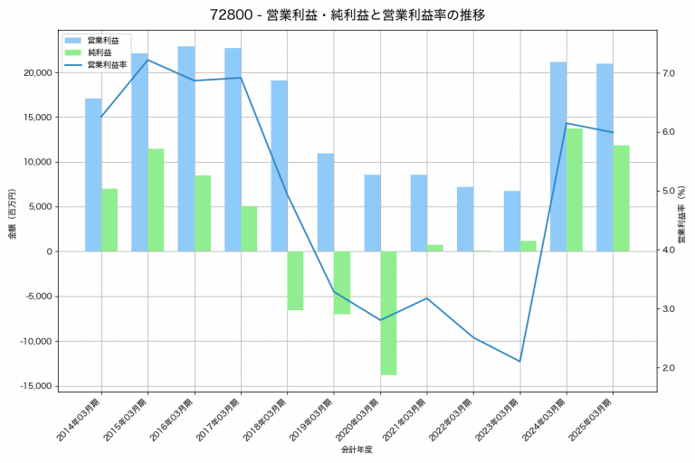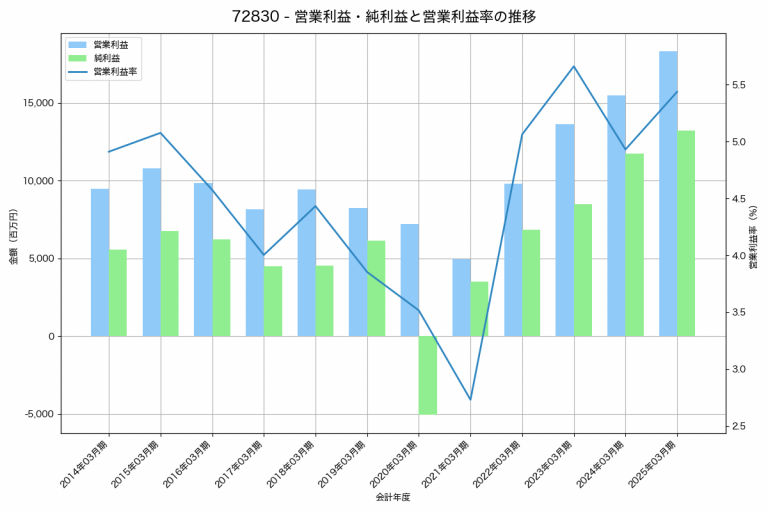 愛三工業の2025年03月期の営業利益は18,338百万円、営業利益率は5.4%と前年比2,840百万円増、営業利益率は0.5%pt増です。