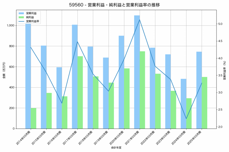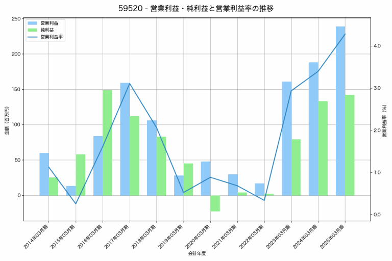 アマテイの2025年03月期の営業利益は239百万円、営業利益率は4.3%と前年比51百万円増、営業利益率は0.9%pt増です。