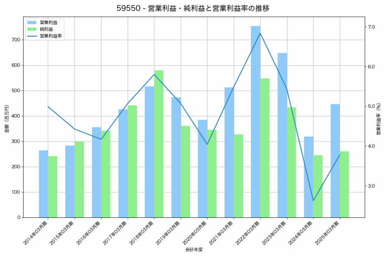 TBKの2025年03月期の営業利益は941百万円、営業利益率は1.7%と前年比38百万円増、営業利益率は0.1%pt増です。