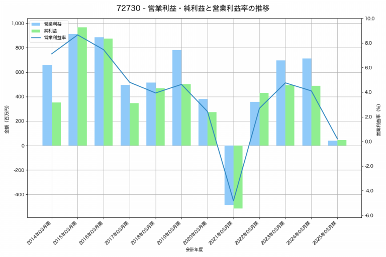 トーソーの2025年03月期の営業利益は746百万円、営業利益率は3.3%と前年比263百万円増、営業利益率は1.0%pt増です。