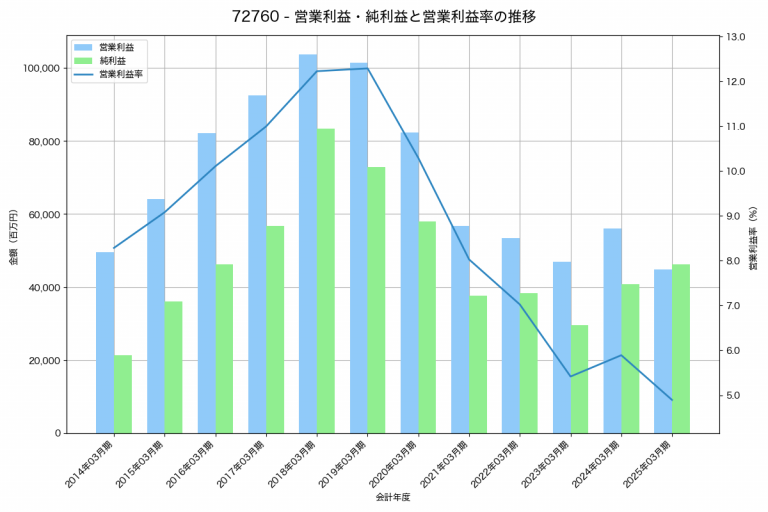 小糸製作所の2025年03月期の営業利益は44,873百万円、営業利益率は4.9%と前年比11,122百万円減、営業利益率は1.0%pt減です。