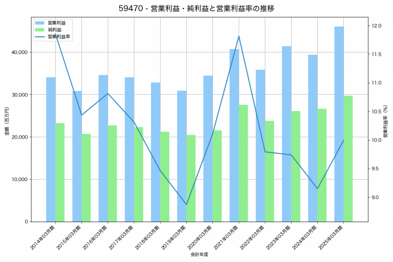 リンナイの2025年03月期の営業利益は46,005百万円、営業利益率は10.0%と前年比6,643百万円増、営業利益率は0.8%pt増です。