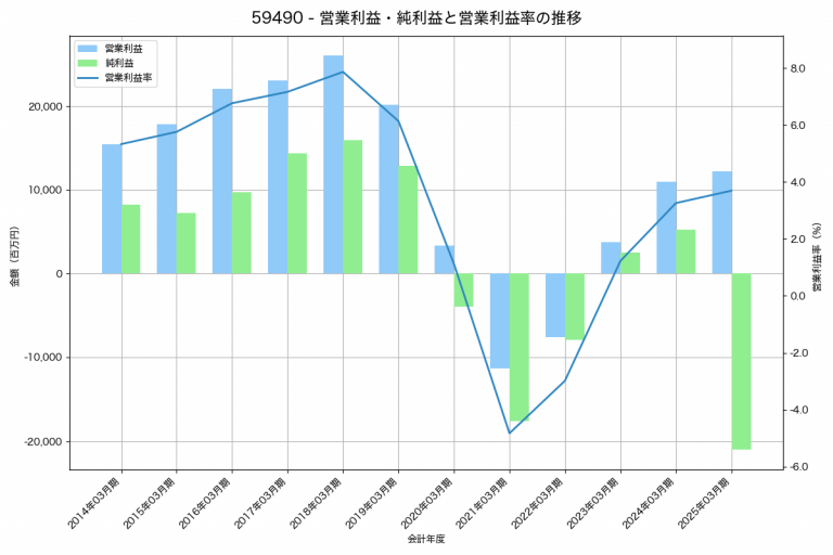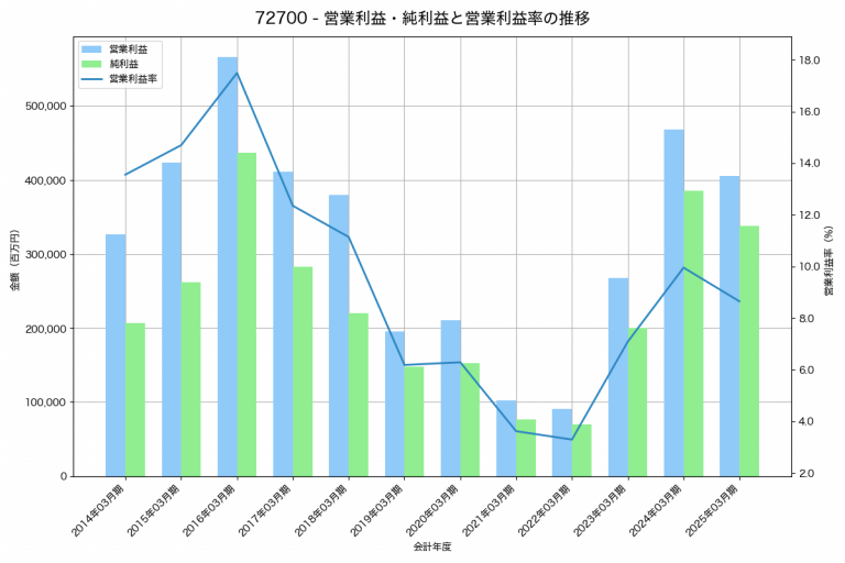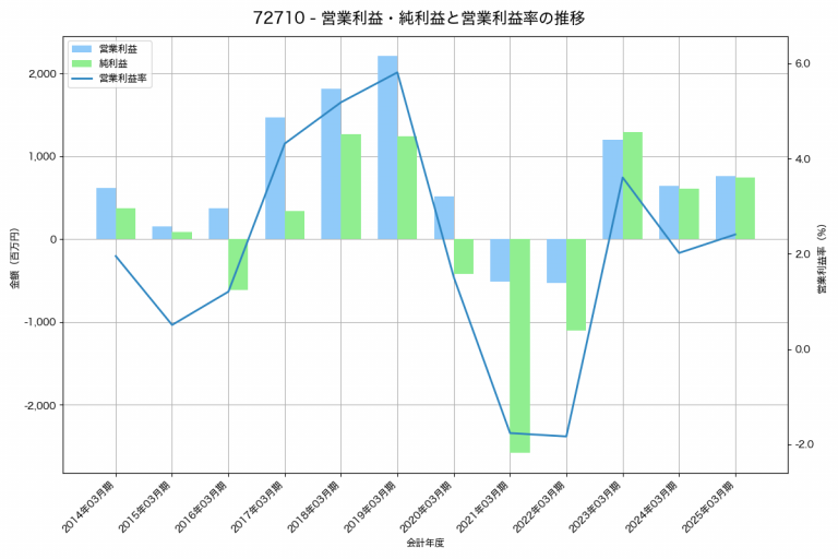 ユニプレスの2025年03月期の営業利益は12,198百万円、営業利益率は3.7%と前年比1,271百万円増、営業利益率は0.4%pt増です。