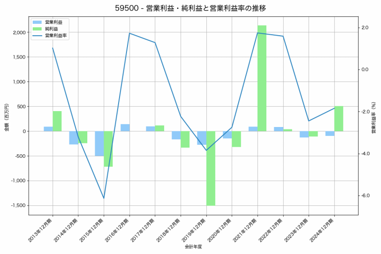 日本パワーファスニングの2024年12月期の営業利益は-93百万円、営業利益率は-1.8%と前年比32百万円増、営業利益率は0.6%pt増です。