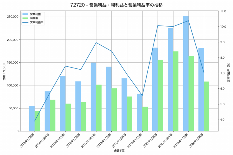 ヤマハ発動機の2024年12月期の営業利益は181,515百万円、営業利益率は7.0%と前年比69,140百万円減、営業利益率は3.3%pt減です。
