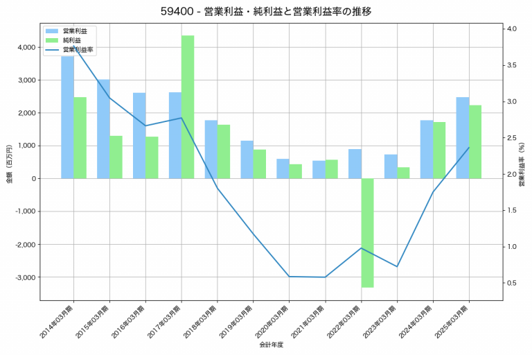 不二サッシの2025年03月期の営業利益は2,475百万円、営業利益率は2.4%と前年比702百万円増、営業利益率は0.6%pt増です。