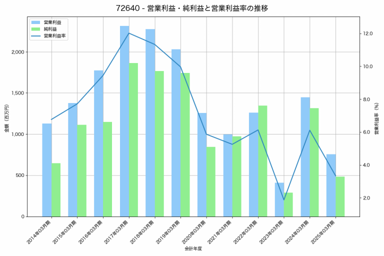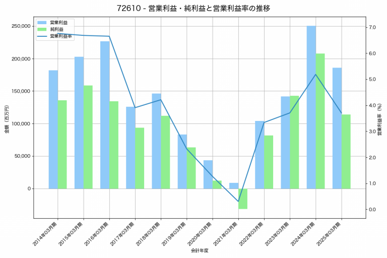 アイシンの2025年03月期の営業利益は202,941百万円、営業利益率は4.1%と前年比59,545百万円増、営業利益率は1.2%pt増です。