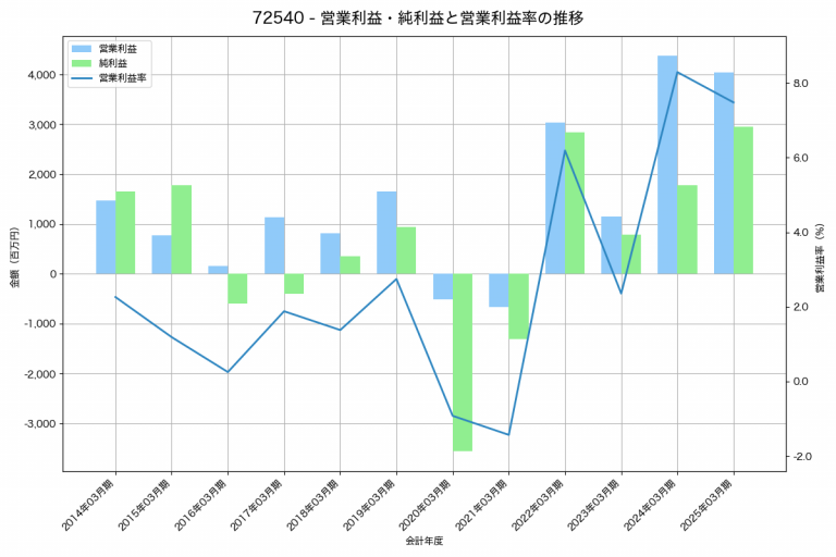 ユニバンスの2025年03月期の営業利益は4,031百万円、営業利益率は7.5%と前年比343百万円減、営業利益率は0.8%pt減です。