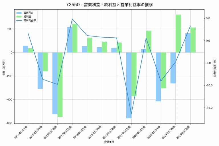 桜井製作所の2025年03月期の営業利益は163百万円、営業利益率は3.3%と前年比426百万円増、営業利益率は8.0%pt増です。