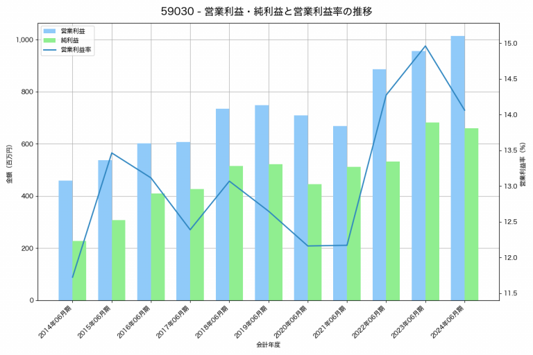 シンポの2024年06月期の営業利益は1,014百万円、営業利益率は14.1%と前年比58百万円増、営業利益率は0.9%pt減です。