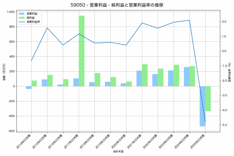 日本製罐の2025年03月期の営業利益は-540百万円、営業利益率は-4.8%と前年比796百万円減、営業利益率は6.9%pt減です。
