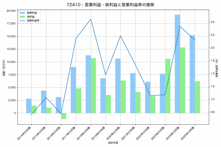 カヤバの2025年03月期の営業利益は22,671百万円、営業利益率は5.2%と前年比254百万円増、営業利益率は0.1%pt増です。
