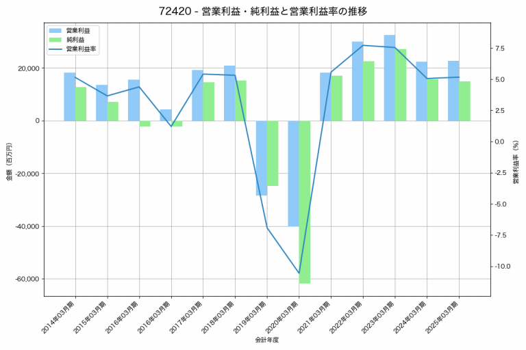 NOKの2025年03月期の営業利益は37,264百万円、営業利益率は4.9%と前年比14,352百万円増、営業利益率は1.8%pt増です。