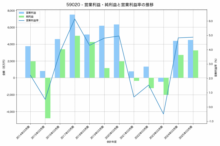 ホッカンホールディングスの2025年03月期の営業利益は4,503百万円、営業利益率は4.9%と前年比113百万円増、営業利益率は0.0%pt増です。