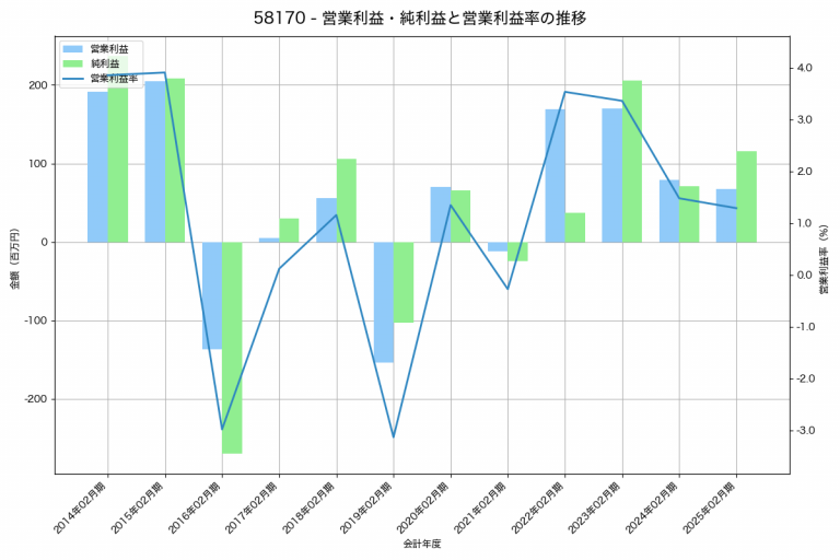 JMACSの2025年02月期の営業利益は67百万円、営業利益率は1.3%と前年比12百万円減、営業利益率は0.2%pt減です。