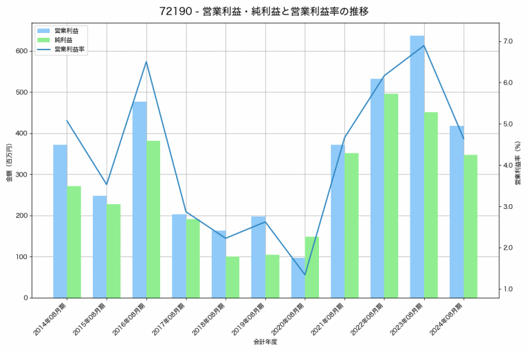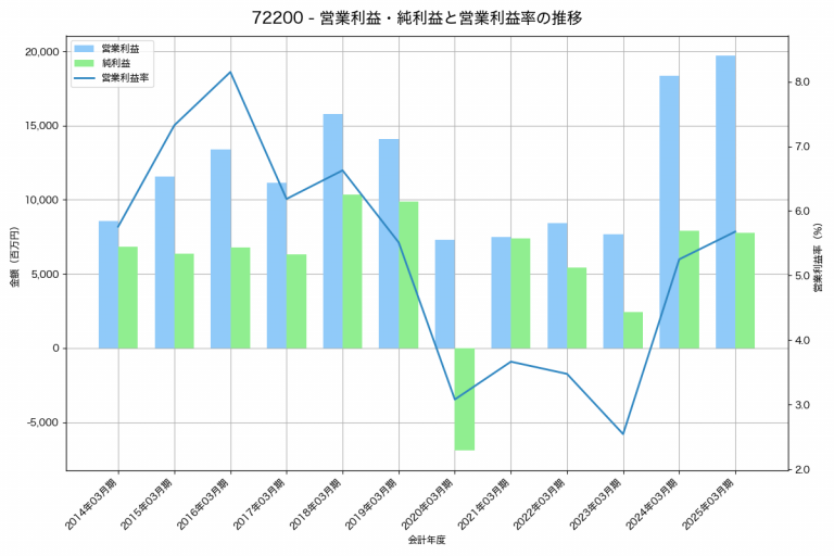 武蔵精密工業の2025年03月期の営業利益は19,720百万円、営業利益率は5.7%と前年比1,346百万円増、営業利益率は0.4%pt増です。