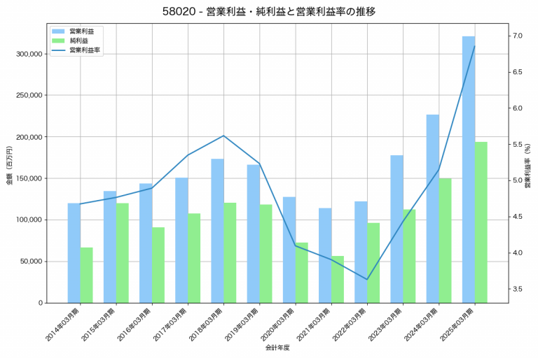 住友電気工業の2025年03月期の営業利益は320,663百万円、営業利益率は6.9%と前年比94,045百万円増、営業利益率は1.7%pt増です。