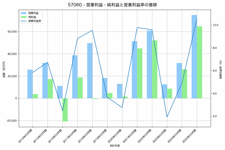 東邦亜鉛の2025年03月期の営業利益は5,625百万円、営業利益率は4.5%と前年比6,315百万円増、営業利益率は5.0%pt増です。