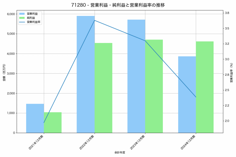 フルサト・マルカホールディングスの2024年12月期の営業利益は3,860百万円、営業利益率は2.4%と前年比1,845百万円減、営業利益率は0.9%pt減です。