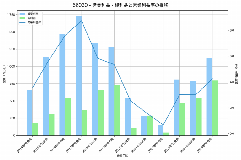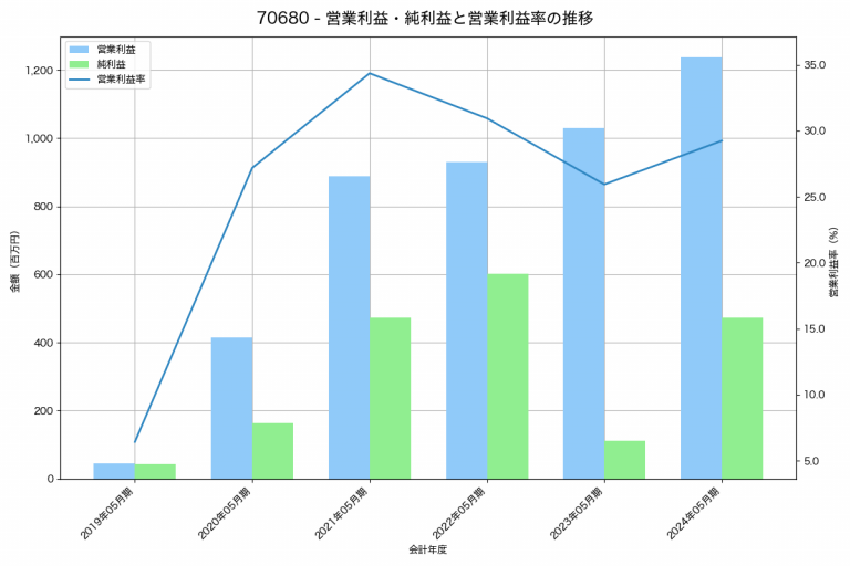 虹技の2025年03月期の営業利益は1,116百万円、営業利益率は4.2%と前年比330百万円増、営業利益率は1.2%pt増です。