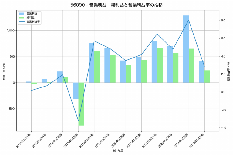 日本鋳造の2025年03月期の営業利益は408百万円、営業利益率は2.9%と前年比879百万円減、営業利益率は5.2%pt減です。