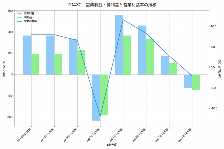 ピアラの2024年12月期の営業利益は-149百万円、営業利益率は-1.1%と前年比234百万円増、営業利益率は3.1%pt増です。