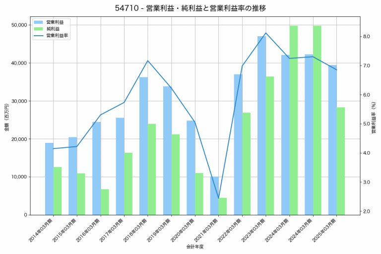 大同特殊鋼の2025年03月期の営業利益は39,408百万円、営業利益率は6.9%と前年比2,842百万円減、営業利益率は0.4%pt減です。