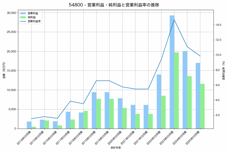 日本冶金工業の2025年03月期の営業利益は16,967百万円、営業利益率は9.9%と前年比3,043百万円減、営業利益率は1.2%pt減です。