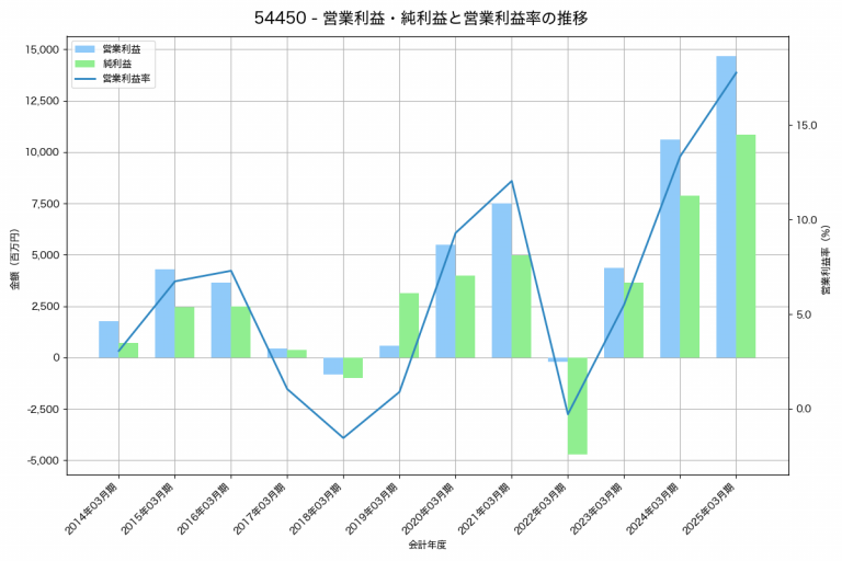 東京鐵鋼の2025年03月期の営業利益は14,676百万円、営業利益率は17.8%と前年比4,052百万円増、営業利益率は4.4%pt増です。
