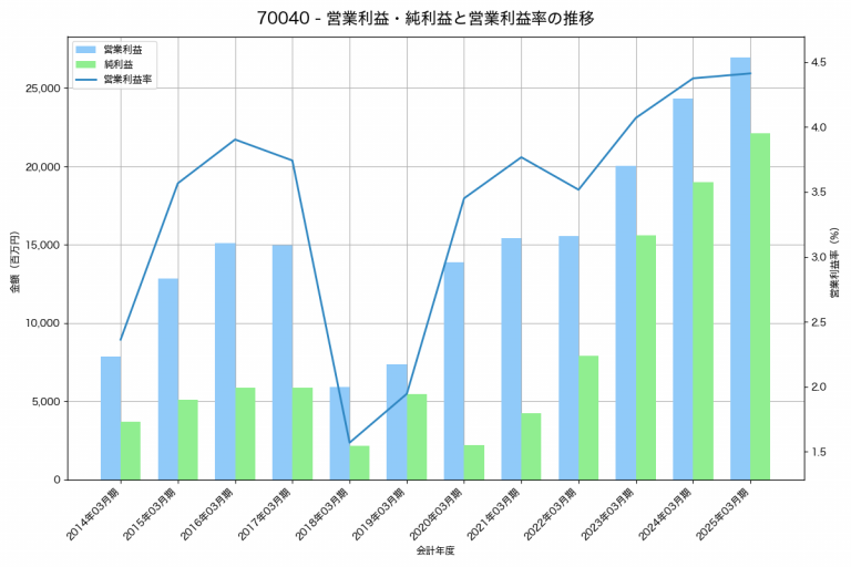 カナデビアの2025年03月期の営業利益は26,946百万円、営業利益率は4.4%と前年比2,623百万円増、営業利益率は0.0%pt増です。