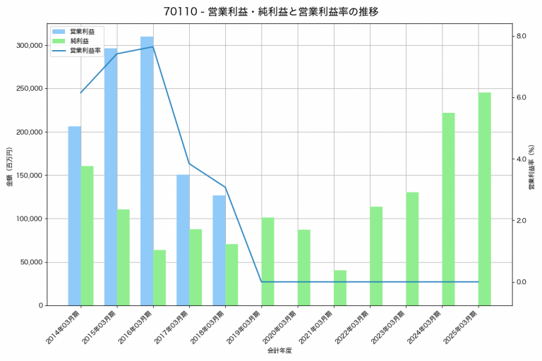 三菱重工業の2025年03月期の営業利益は0百万円、営業利益率は0.0%と前年比0百万円増、営業利益率は0.0%pt増です。