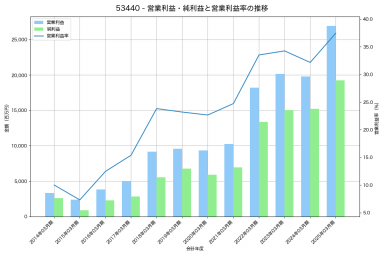 MARUWAの2025年03月期の営業利益は26,914百万円、営業利益率は37.5%と前年比7,113百万円増、営業利益率は5.3%pt増です。