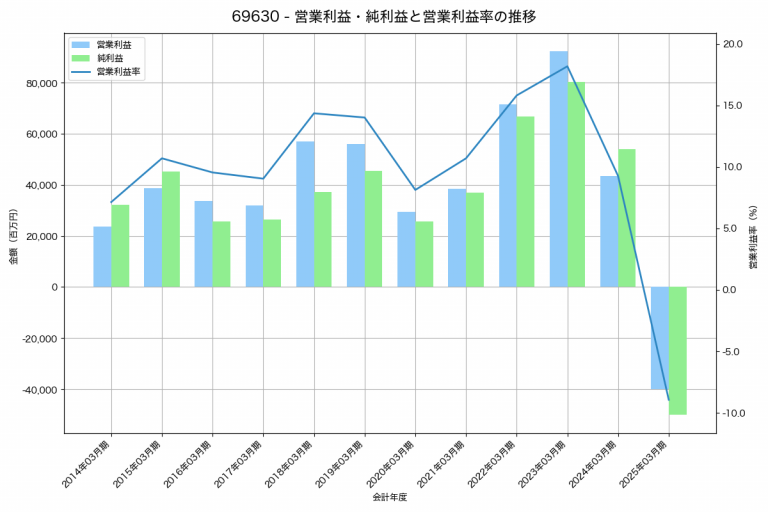 ロームの2025年03月期の営業利益は-40,061百万円、営業利益率は-8.9%と前年比83,388百万円減、営業利益率は18.2%pt減です。