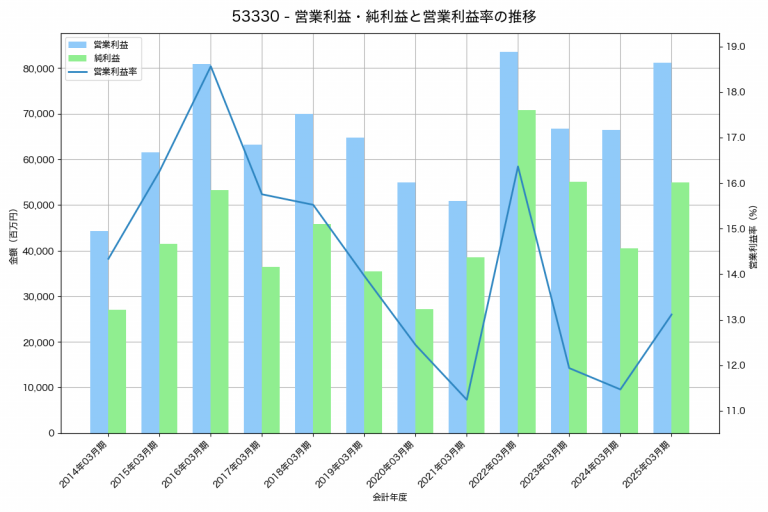 日本碍子の2025年03月期の営業利益は81,241百万円、営業利益率は13.1%と前年比14,844百万円増、営業利益率は1.6%pt増です。