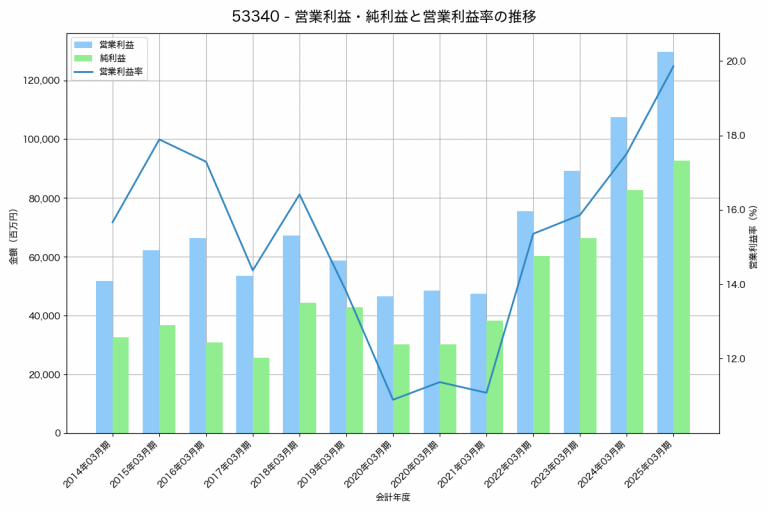日本特殊陶業の2025年03月期の営業利益は129,660百万円、営業利益率は19.9%と前年比22,069百万円増、営業利益率は2.3%pt増です。