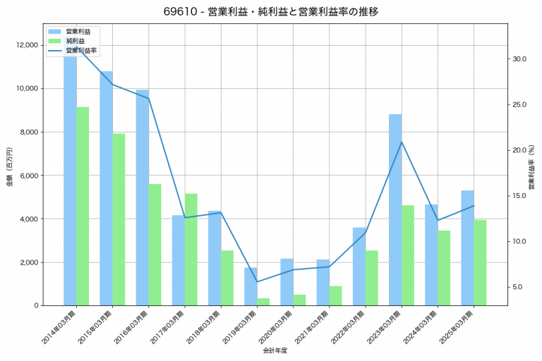 エンプラスの2025年03月期の営業利益は5,287百万円、営業利益率は13.9%と前年比642百万円増、営業利益率は1.6%pt増です。
