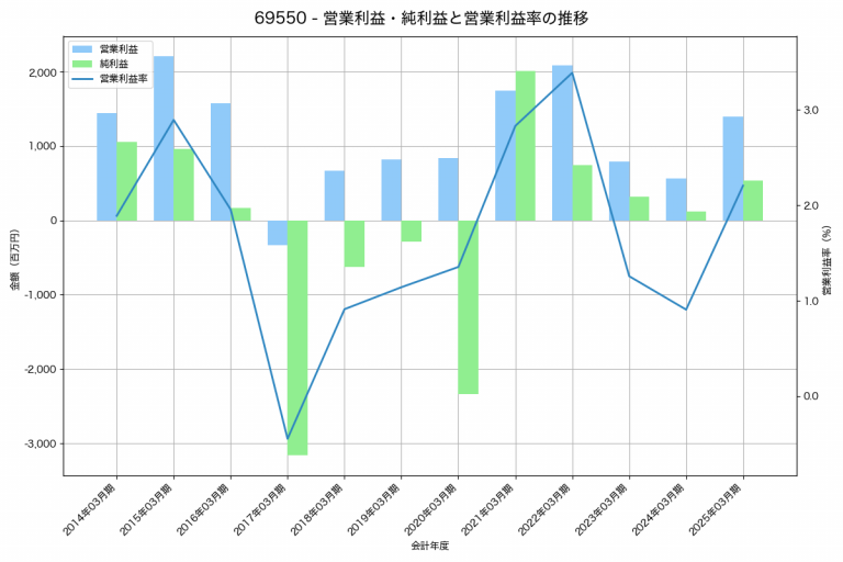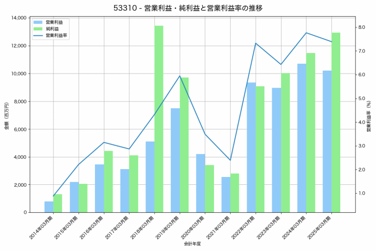 ノリタケの2025年03月期の営業利益は10,213百万円、営業利益率は7.4%と前年比496百万円減、営業利益率は0.4%pt減です。