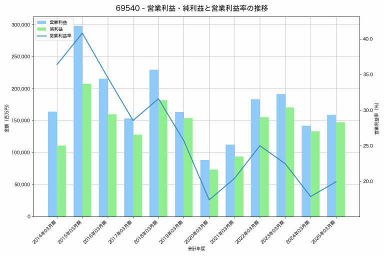 ファナックの2025年03月期の営業利益は158,846百万円、営業利益率は19.9%と前年比16,927百万円増、営業利益率は2.1%pt増です。