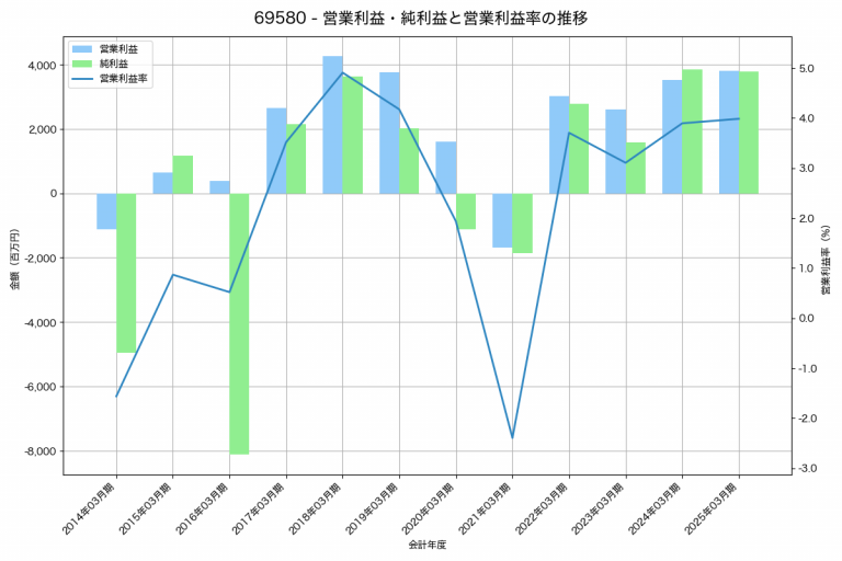 芝浦電子の2025年03月期の営業利益は5,442百万円、営業利益率は16.0%と前年比338百万円増、営業利益率は0.2%pt増です。