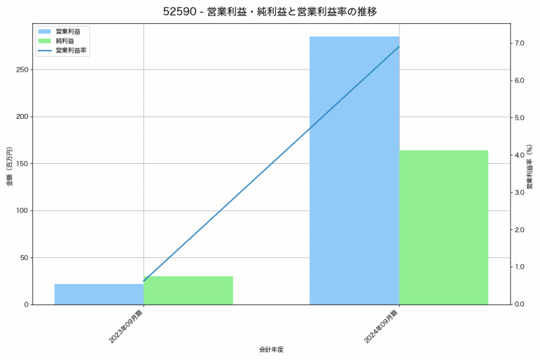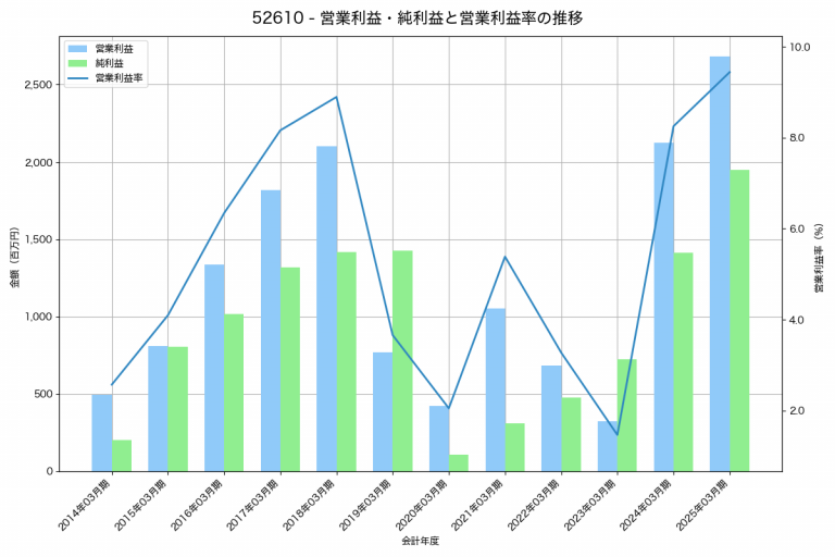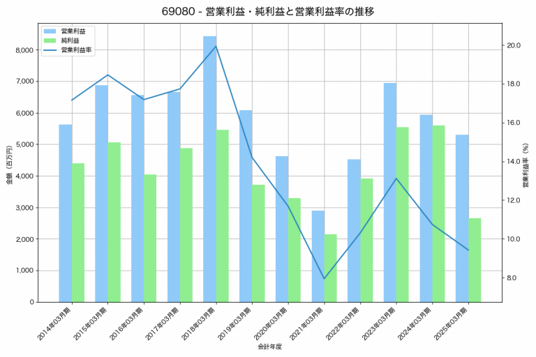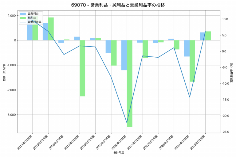 ジオマテックの2025年03月期の営業利益は323百万円、営業利益率は6.1%と前年比978百万円増、営業利益率は20.3%pt増です。