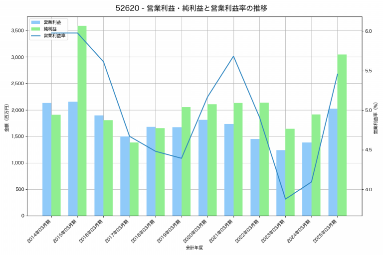 日本ヒュームの2025年03月期の営業利益は2,022百万円、営業利益率は5.5%と前年比641百万円増、営業利益率は1.4%pt増です。