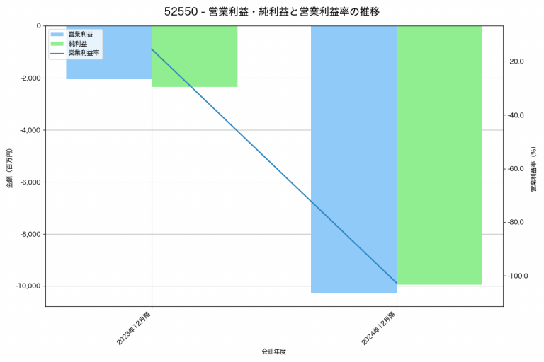 モンスターラボの2024年12月期の営業利益は-10,269百万円、営業利益率は-102.7%と前年比8,213百万円減、営業利益率は87.3%pt減です。