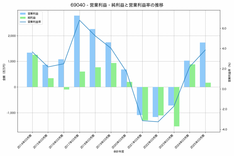 原田工業の2025年03月期の営業利益は1,729百万円、営業利益率は3.9%と前年比703百万円増、営業利益率は1.7%pt増です。
