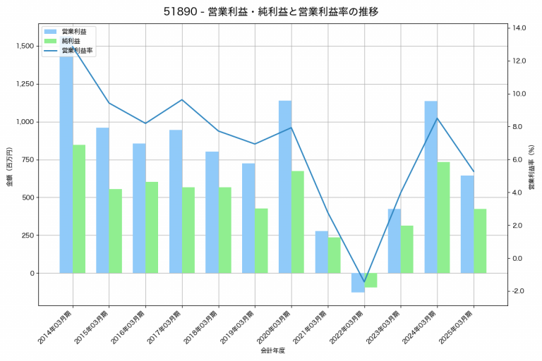 櫻護謨の2025年03月期の営業利益は643百万円、営業利益率は5.3%と前年比493百万円減、営業利益率は3.2%pt減です。