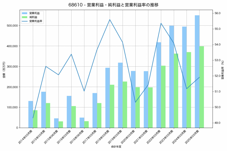 キーエンスの2025年03月期の営業利益は549,775百万円、営業利益率は51.9%と前年比54,761百万円増、営業利益率は0.7%pt増です。