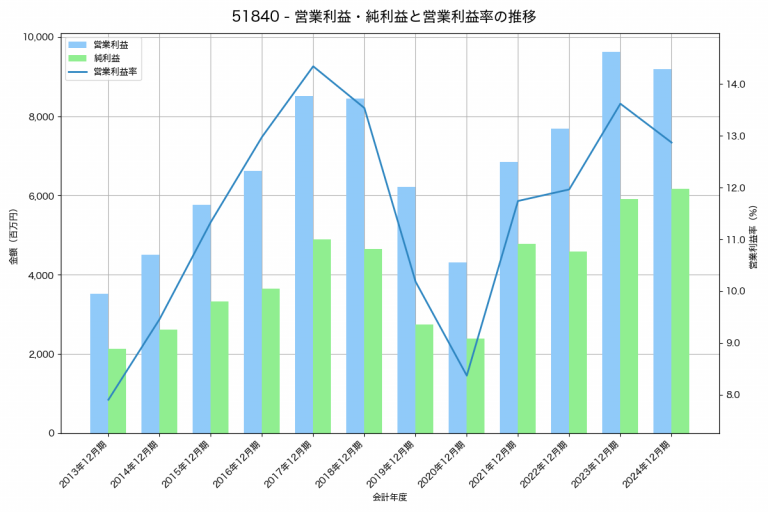ニチリンの2024年12月期の営業利益は9,184百万円、営業利益率は12.9%と前年比436百万円減、営業利益率は0.7%pt減です。