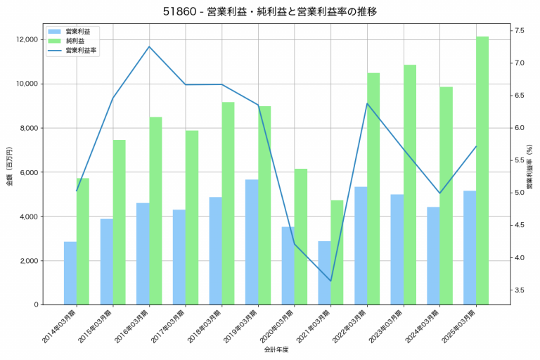 ニッタの2025年03月期の営業利益は5,155百万円、営業利益率は5.7%と前年比734百万円増、営業利益率は0.7%pt増です。
