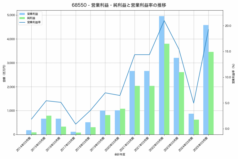 日本電子材料の2025年03月期の営業利益は4,585百万円、営業利益率は19.2%と前年比3,715百万円増、営業利益率は14.3%pt増です。